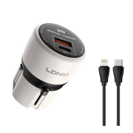 Φορτιστής τοίχου από την LDNIO, κατάλληλος για χρήση με τύπους πριζών EU (Ευρώπης), UK (Αγγλίας), US (Αμερικής) και AU (Αυστραλίας). Η εναλλαγή της πρίζας γίνεται εύκολα με συρόμενο κουμπί. Εξοπλίζεται με USB και USB-C θύρες εξόδου, για την φόρτιση συσκευών, με μέγιστη απόδοση 30W.